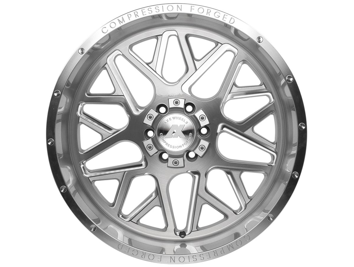 Built to last, each wheel is made of compression forged cast aluminum. The wheel is then covered in a brushed silver finish that is enhanced by the engraved logo and the simulated rivets on the flange. The center cap is adorned with the Axe logo to complete the look.
