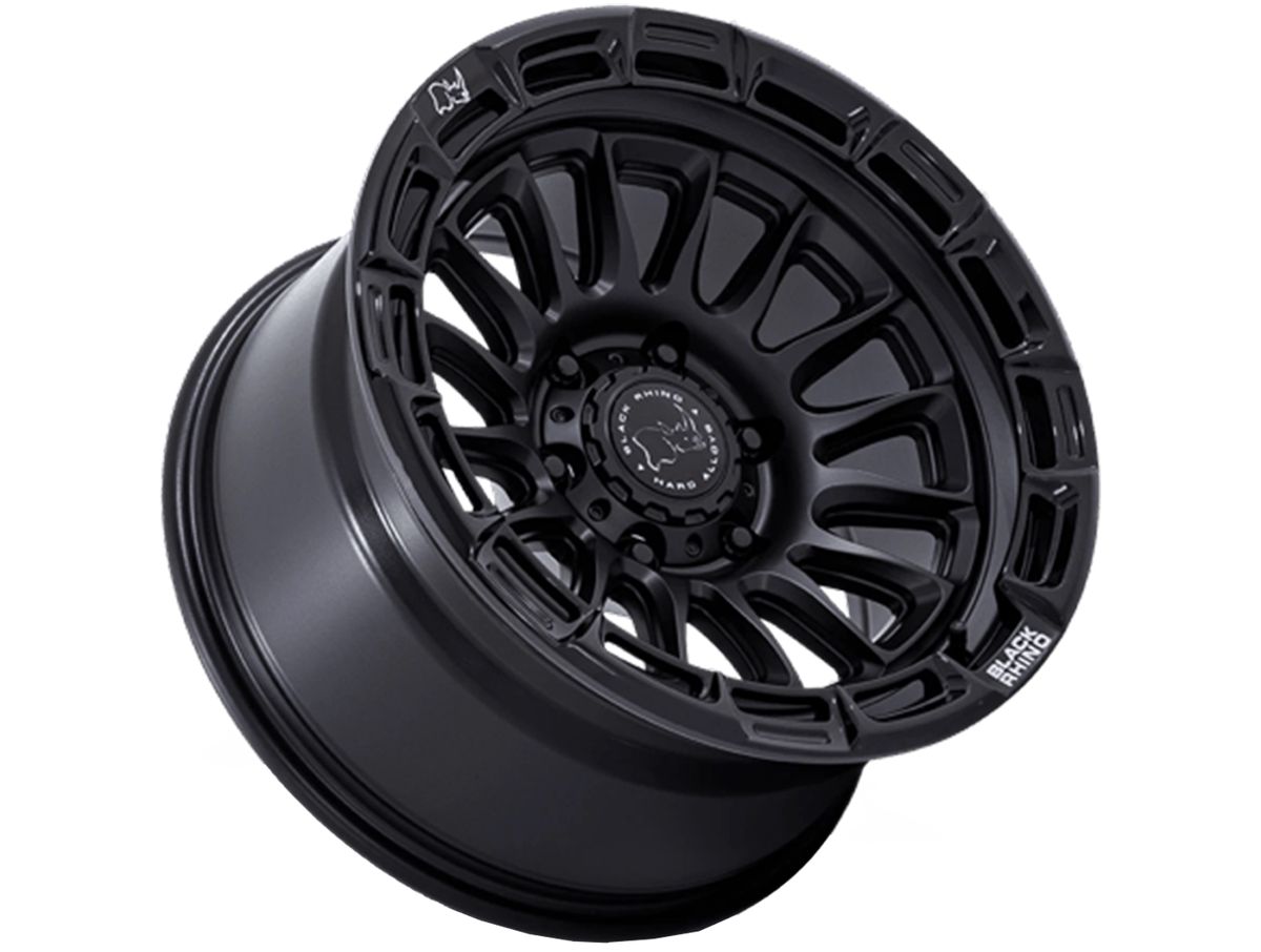 The spokes feature added milled “webbing” between them to create depth and contour. The wheel is covered in a matte black finish that is enhanced by the gloss black simulated beadlock bead ring around the lip of the wheel. The center cap is adorned with the Black Rhino to complete the look.