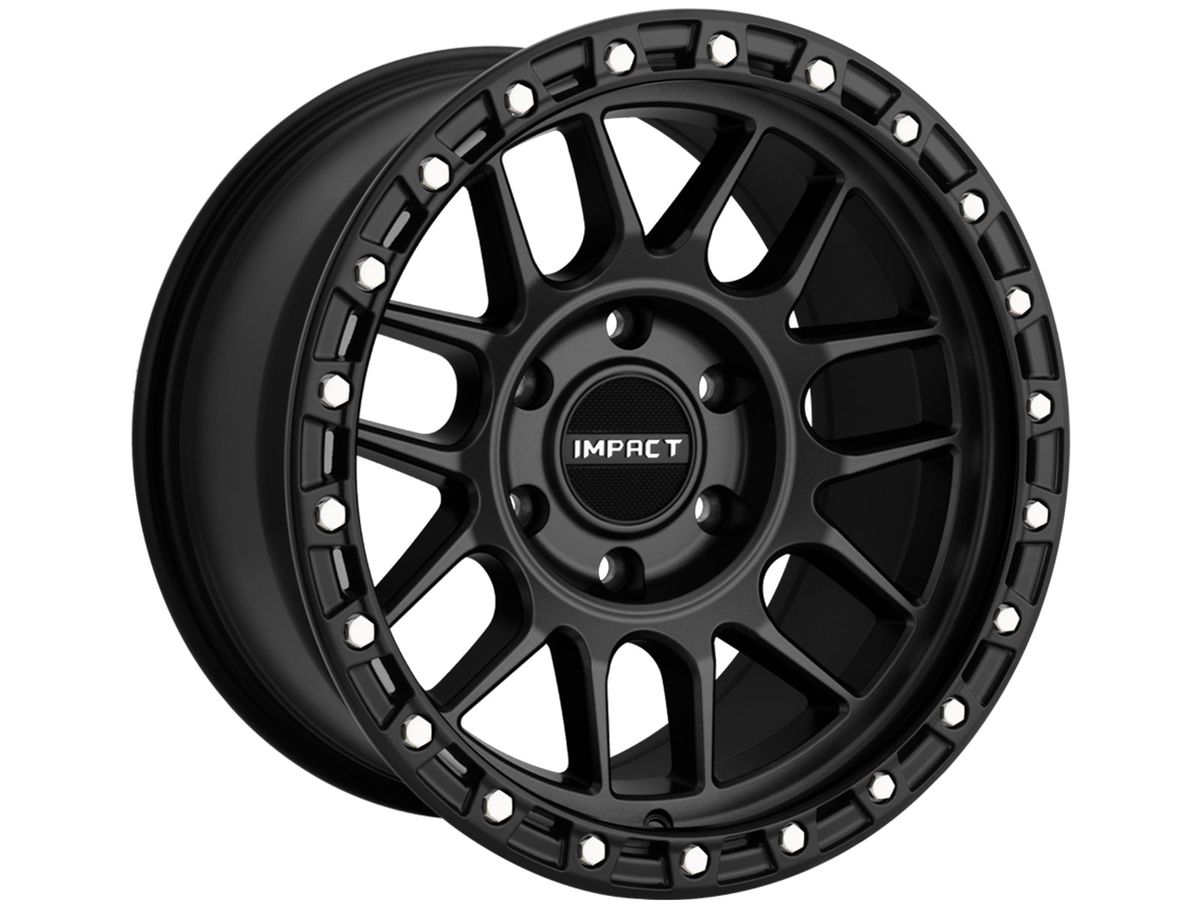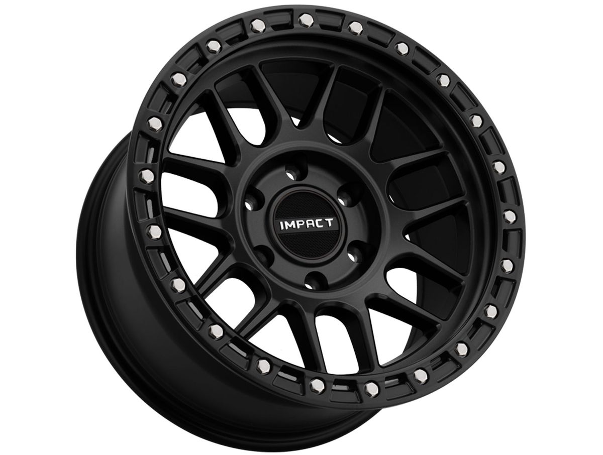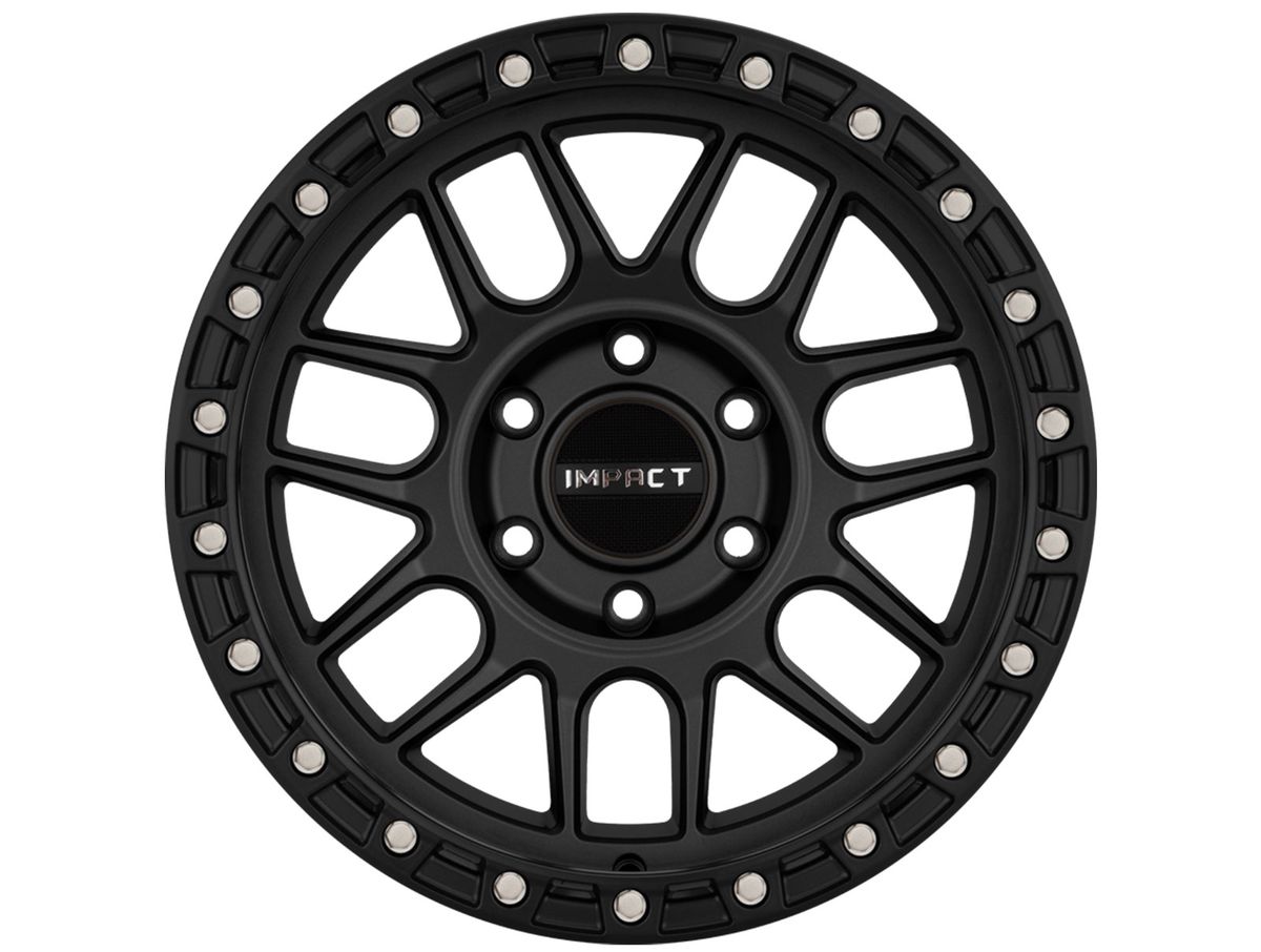 The spokes are split with a narrow window creating depth and contour. The wheel is covered in a satin black finish that is offset by the simulated beadlock ring around the outer edge. To complete the look, the center cap is adorned with the Impact Off-Road logo.