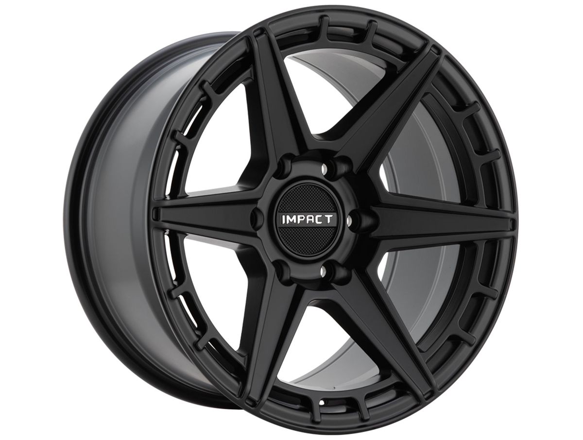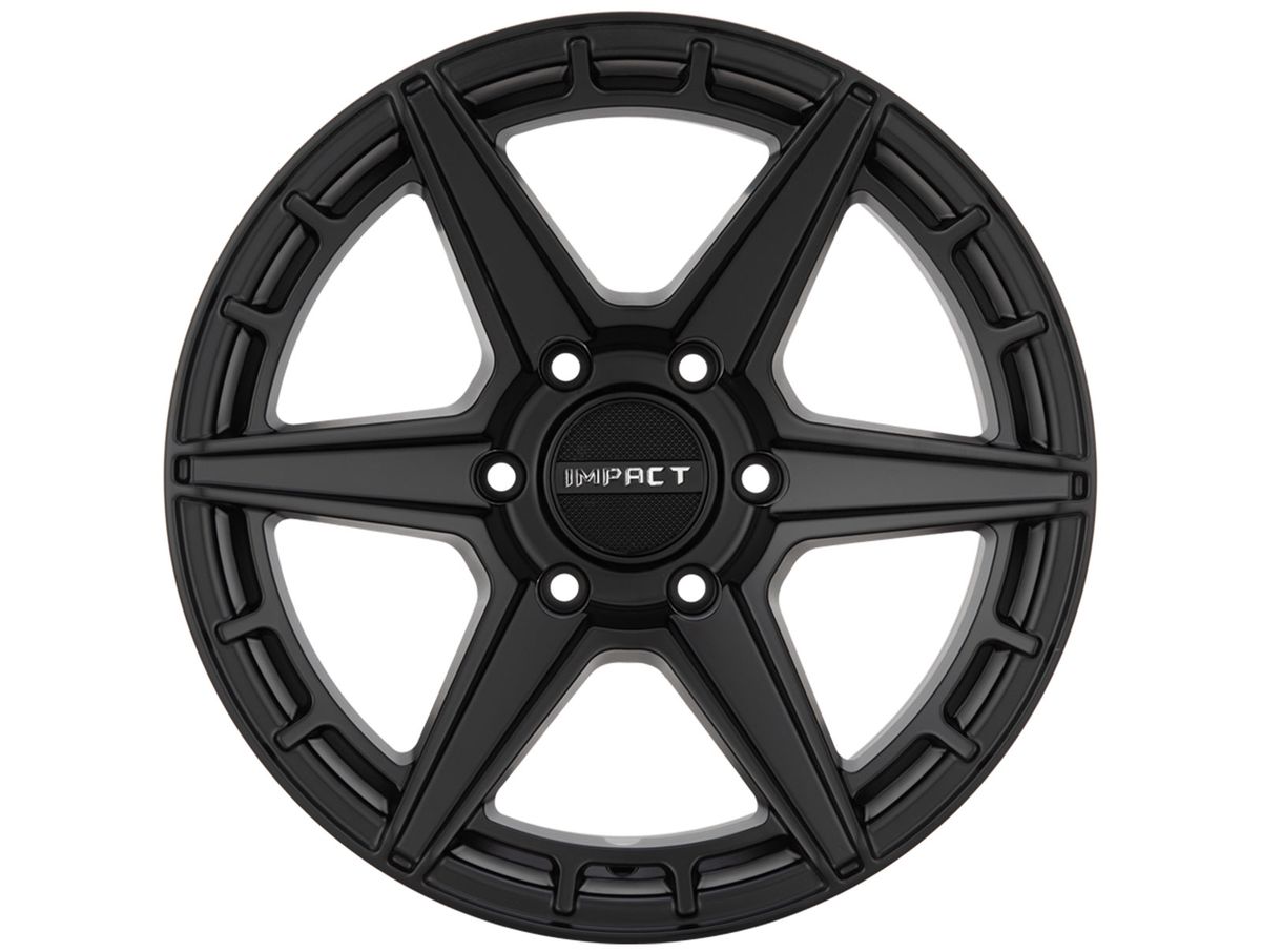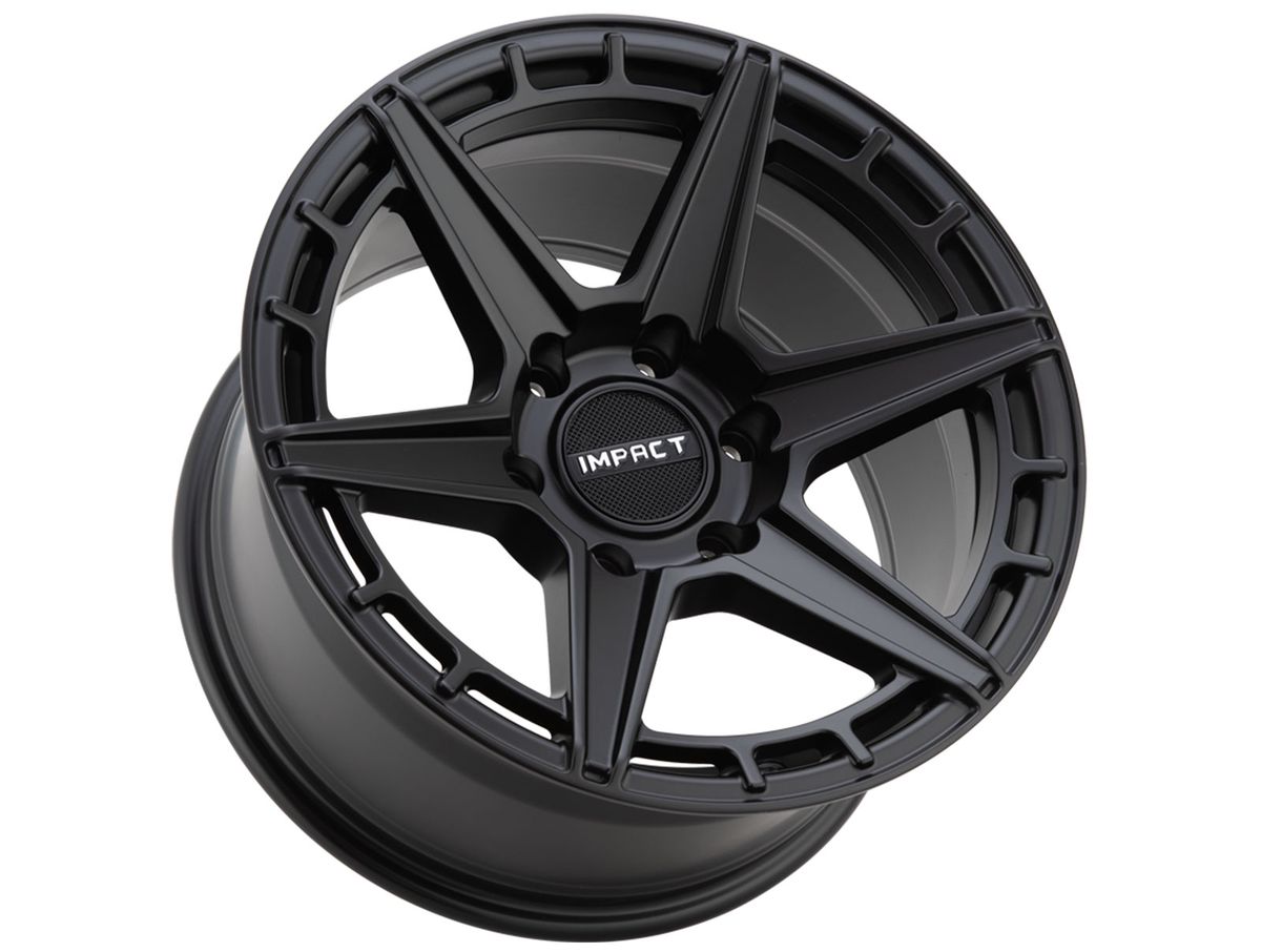 Each wheel is constructed from a one-piece durable cast aluminum. The wheel is then covered in a satin black finish that is offset the mini spokes around the outer edge. The center cap is adorned with the Impact Off-Road logo to complete the look.