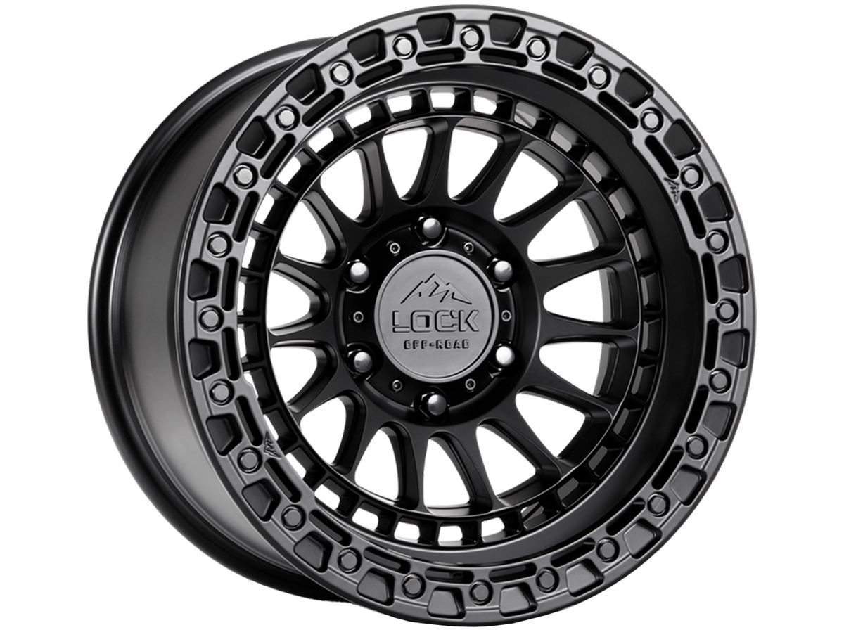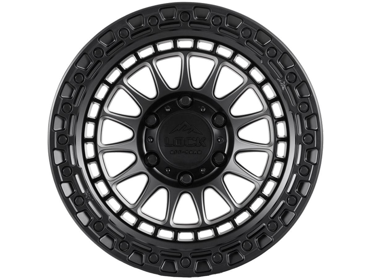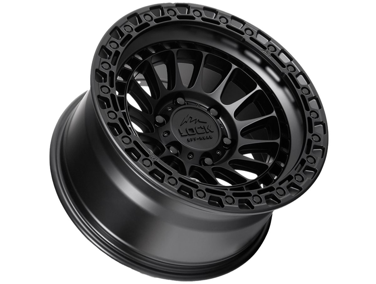 The wheel is covered in a matte black finish that is enhanced by the matte black simulated beadlock ring. The center cap is also adorned with the Lock Off-Road logo to complete the look.
