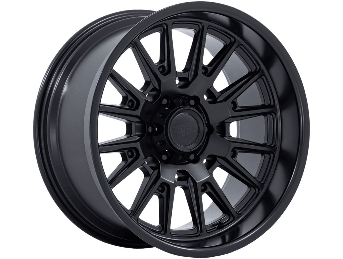 The wheel is covered in a matte black finish that is enhanced by the thin spokes. The center cap is adorned with the Moto Metal logo to complete the look.