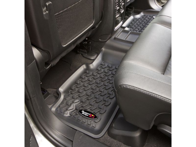 Need an affordable solution to keep the cabin floors of your Jeep looking factory fresh? Try Rugged Ridge's All Terrain Floor Liners! Made of a durable OE-quality thermoplastic material that can withstand the rigor of daily abuse, each liner is perfectly contoured to your vehicle's floor for precise secure fitment (floor hook attachment where applicable). The raised lip captures all spills, water, and debris keeping your interior pristine. Features a chevron shape patented deep tread technology.