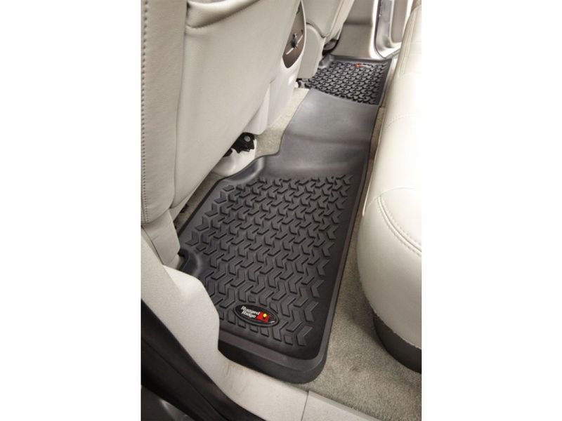 Need an affordable solution to keep the cabin floors of your Jeep looking factory fresh? Try Rugged Ridge's All Terrain Floor Liners! Made of a durable OE-quality thermoplastic material that can withstand the rigor of daily abuse, each liner is perfectly contoured to your vehicle's floor for precise secure fitment (floor hook attachment where applicable). The raised lip captures all spills, water, and debris keeping your interior pristine. Features a chevron shape patented deep tread technology.