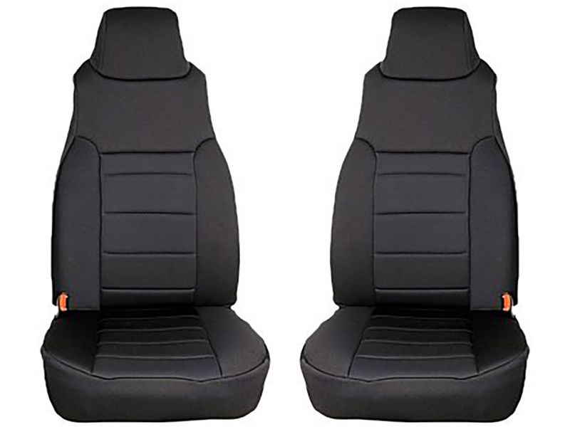 Rugged Ridge constructed our Seat Cover Kits from durable water-resistant neoprene creating the best looking custom seat cover available. Neoprene, the fabric used in scuba diving suits, is extremely resilient to the elements to help protect your seats from whatever Mother Nature can throw at them. No more burned legs from hot vinyl seats or panicking when the clouds open up and your Jeep is topless and exposed! Each cover is custom-tailored for your Jeep's original equipment seat dimensions making your seats look great on the outside while keeping them safely preserved underneath a protective shell. Installation is easy with special designed elastic cords, nylon straps, and hooks that secure the cover discretely. Available in a variety of colors to accent any Jeep’s interior - all black or black with red, tan, or gray inserts. Kit includes a pair of front bucket seat covers and a rear seat cover.