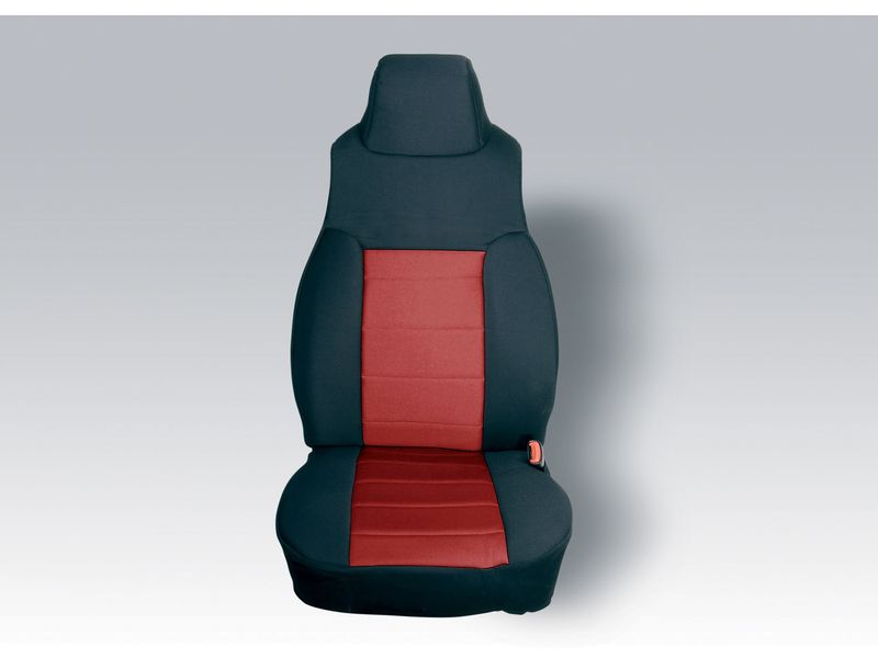Rugged Ridge constructed our Seat Cover Kits from durable water-resistant neoprene creating the best looking custom seat cover available. Neoprene, the fabric used in scuba diving suits, is extremely resilient to the elements to help protect your seats from whatever Mother Nature can throw at them. No more burned legs from hot vinyl seats or panicking when the clouds open up and your Jeep is topless and exposed! Each cover is custom-tailored for your Jeep's original equipment seat dimensions making your seats look great on the outside while keeping them safely preserved underneath a protective shell. Installation is easy with special designed elastic cords, nylon straps, and hooks that secure the cover discretely. Available in a variety of colors to accent any Jeep’s interior - all black or black with red, tan, or gray inserts. Kit includes a pair of front bucket seat covers and a rear seat cover.