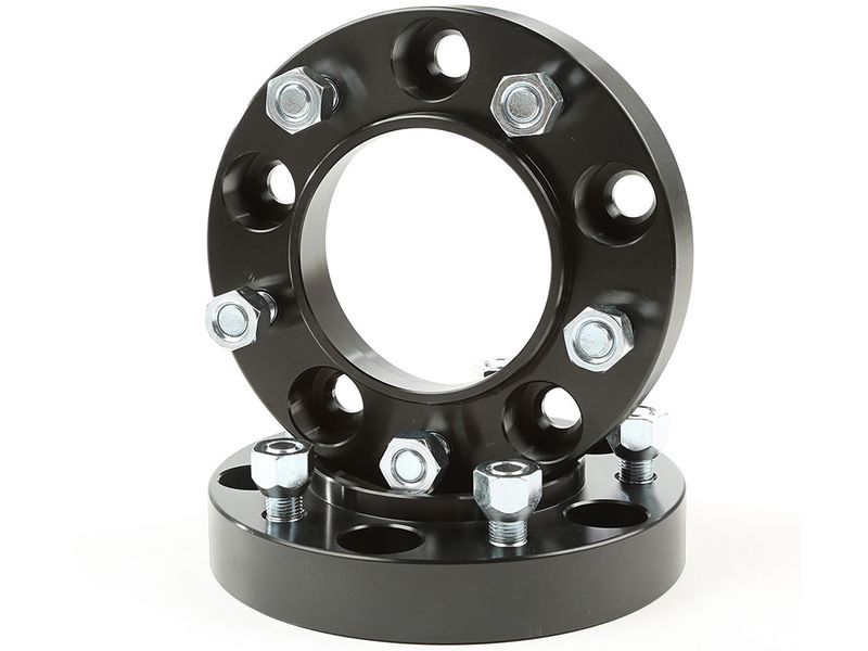 This pair of 1.25-inch thick black aluminum wheel spacers from Rugged Ridge moves your wheels out to help fit wider tires and give your Jeep a wider track and improved stability. Constructed of double anodized black extra thick 6061T6 aluminum for long life and extra corrosion resistance. All hardware is grade-8 for extra strength.